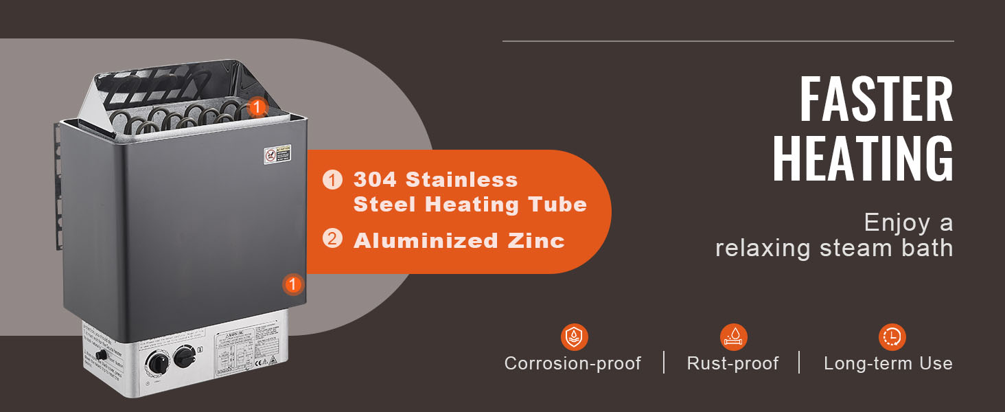 - Built to Last Construction: The sauna heater features an aluminized zinc shell, ensuring high resistance to corrosion and a long lifespan for the heater, even in high humidity environments. The 304 stainless steel heating element ensures quick and even heat distribution, providing a comfortable sauna experience in a short amount of time. Before purchasing, please carefully review the product details (voltage, power, additional accessories and parts required, installation information, etc.)